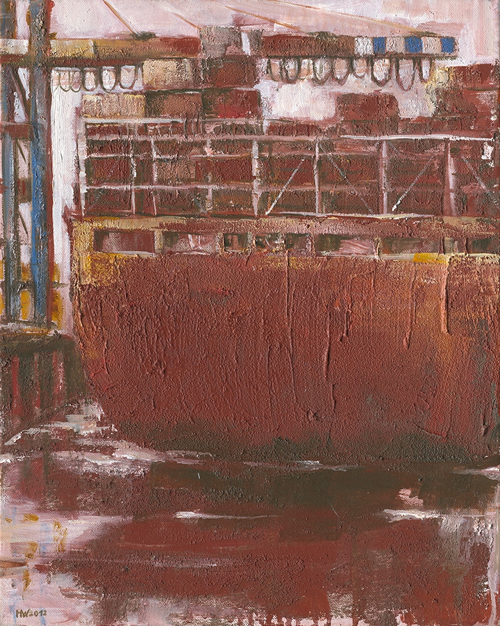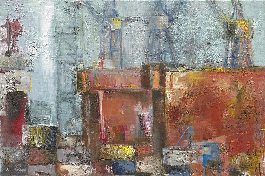 Helma Wolff fügt Intuition und Komposition zu einer bildnerischen Einheit zusammen. Die massiv wirkenden flächig-geometrischen Container, Schiffsrümpfe und Gebäude finden auf ihren Gemälden ihren Gegenpol in den filigran und grafisch wirkenden Brücken und Kränen. Komplementäre Farbflächen sind in Kontrast gesetzt zu gebrochenen, häufig grauen oder rostigen Naturtönen. Umgesetzt wird dieses Gestaltungskonzept in einer vielschichtig angelegten Mischtechnik. Seit 2001 arbeitet Helma Wolff als freischaffende Künstlerin. Ihre Malerei hat sich in den letzten Jahren zu einem dichten stilistischen Bildausdruck entwickelt und hat zu überregional beachteten Einzelausstellungen und Ausstellungsbeteiligungen sowohl in Deutschland als auch in den Niederlanden geführt. Helma Wolff lebt und arbeitet in Hamburg.