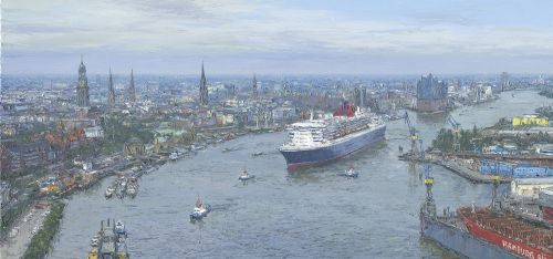Luftansicht Hafenpanorama mit Queen Mary II