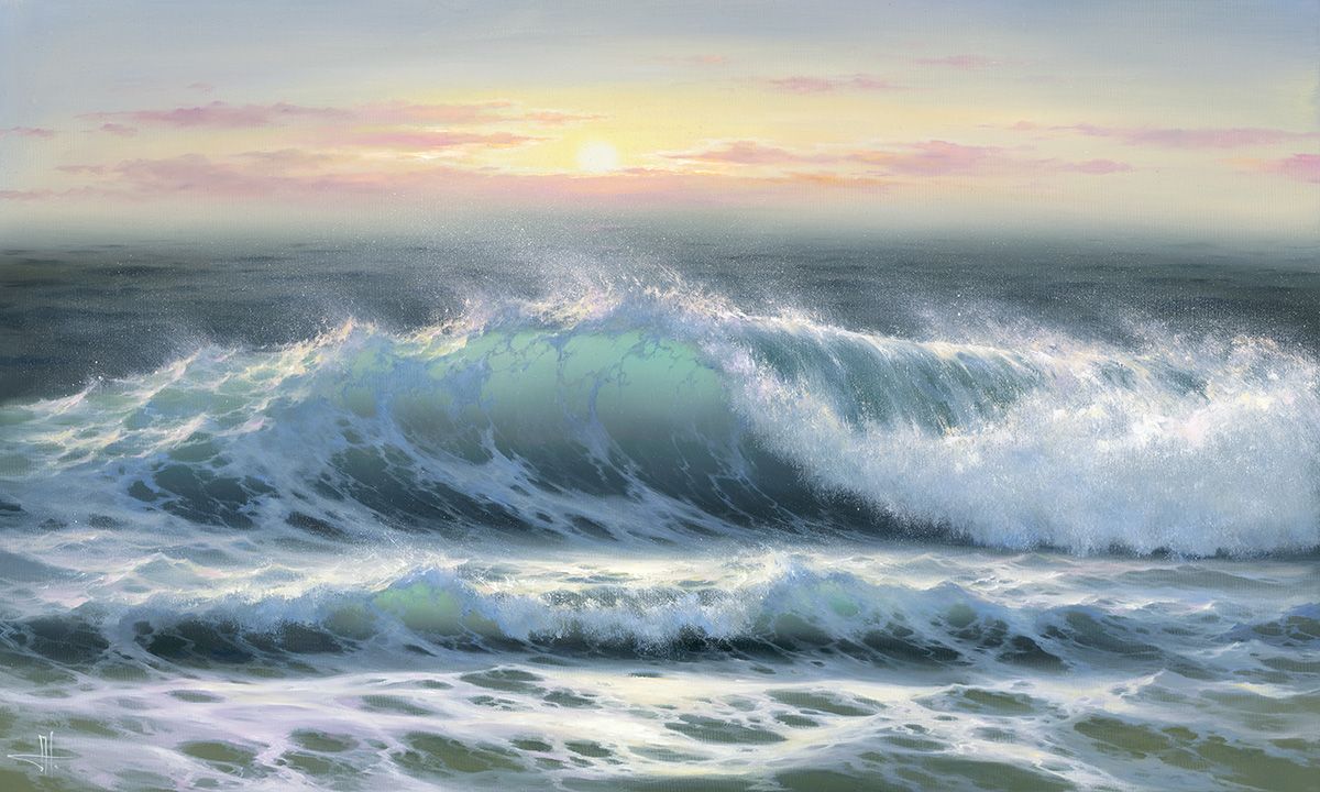 Das Meer auf ihren Leinwänden zeigt sich in vielen Facetten: geheimnisvoll, unbeständig, unermesslich —es lebt ein eigenes Leben, geprägt von Bewegung, Aufregung und Schönheit. Sonnenstrahlen brechen sich in den Wellen und spielen mit unterschiedlichen Schattierungen, sodass der Betrachter die Lebendigkeit des Meeres in ihrer ganzen Fülle erleben kann.