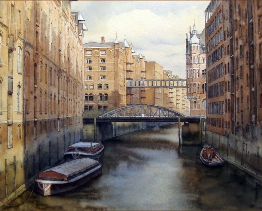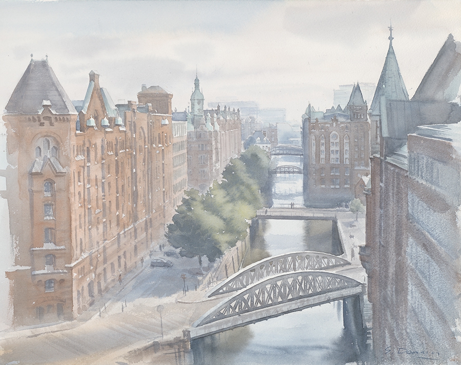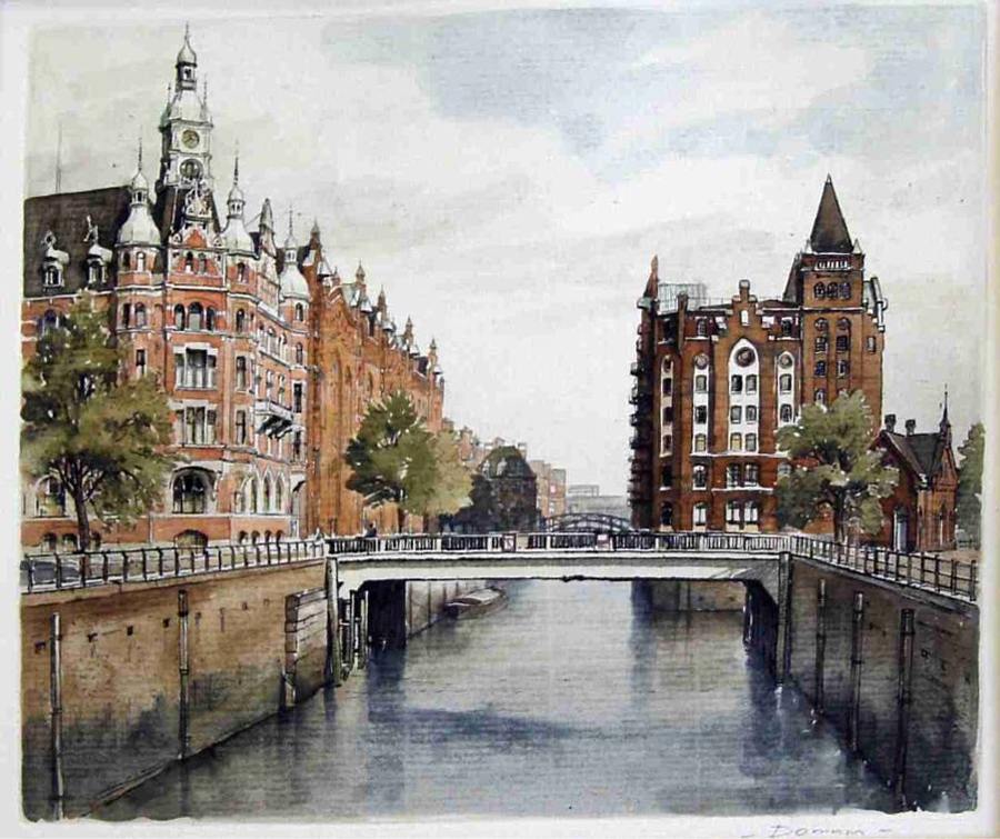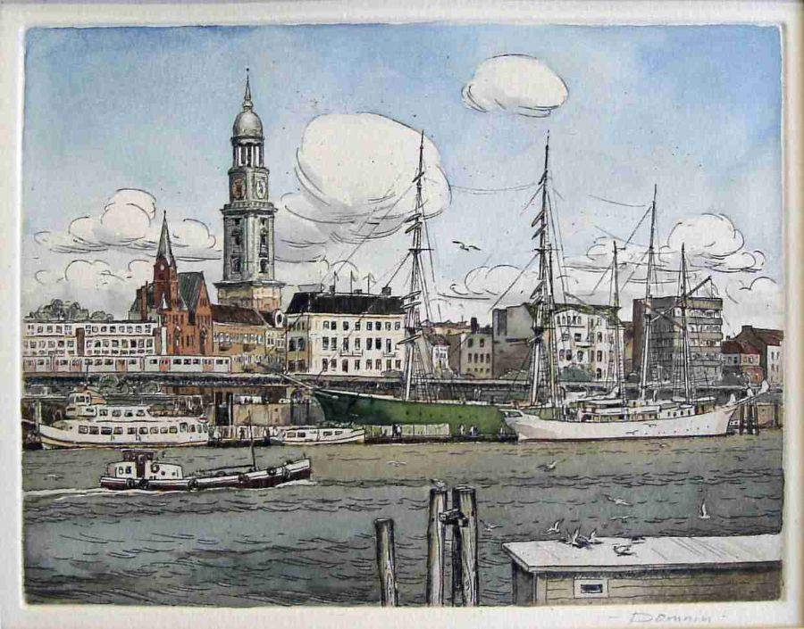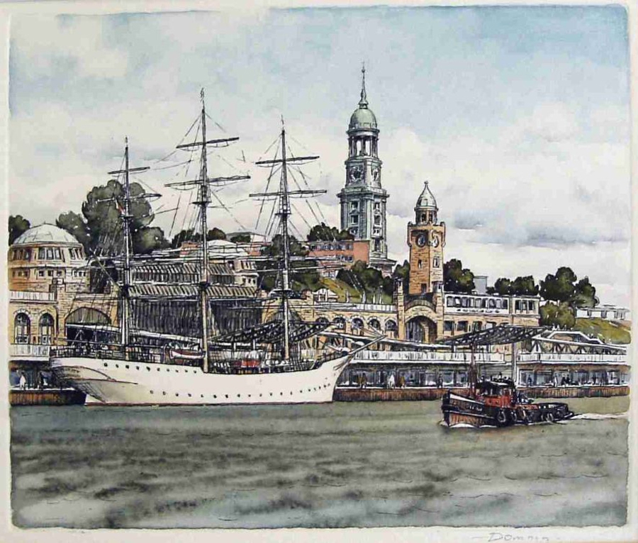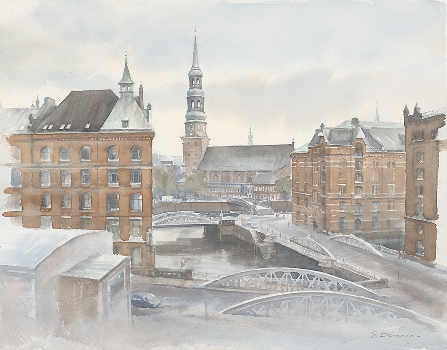 Seit seinem Studium arbeitet Domnin als freischaffender Künstler – zunächst in der UdSSR, seit einigen Jahren in Deutschland. Es entstanden zunächst vorwiegend Aquarelle in Form von Frankfurter und Hamburger Stadtlandschaften. Bei diesen Arbeiten handelt es sich um erstklassige Beispiele für das schulmäßige Umgehen mit der Aquarellrechnik. Die genaue, fast journalistische Beobachtung von Architektur und Stimmung spielt für Alexander Domnin dabei eine besonders wichtige Rolle. Es gibt nicht viele Künstler in Hamburg, die sich dem aquarellierten Dialog mit der Stadt so gewissenhaft und gekonnt widmen wie Alexander Domnin. Dabei sollte man nicht übersehen, dass das leichte, klassische Aquarell keineswegs das einfachste Stilmittel zur Widergabe konstruktiver, architekturbestimmter Sujets darstellt.