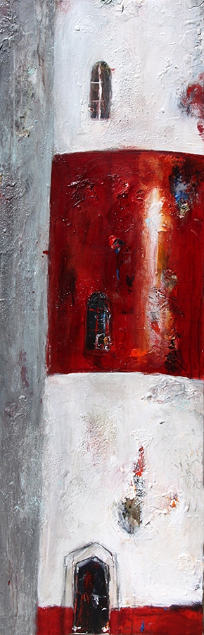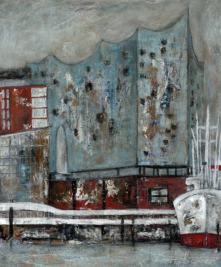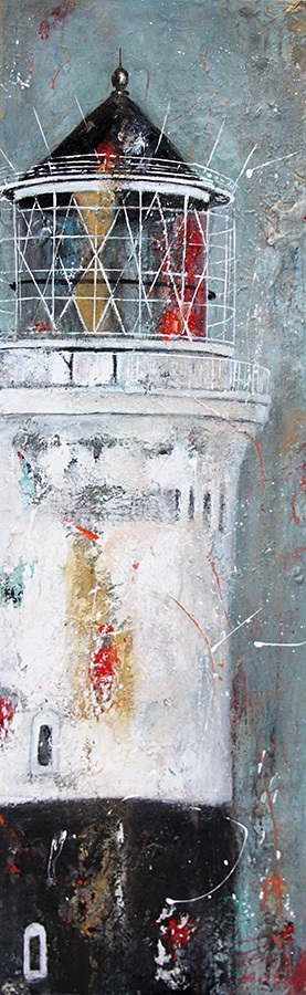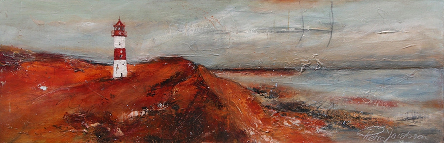 Ob es die Küstenlinie, der Leuchtturm oder die Küstenstadt ist – die Impressionen entstehen aus der expressiven Bearbeitung der Flächen in den Bildern von Petra Jacobsen. Die daraus entstehende Spannung und Reibung, die Vielschichtigkeit und der Kontrastreichtum aus Farben und Strukturen machen die Motive originär und authentisch.