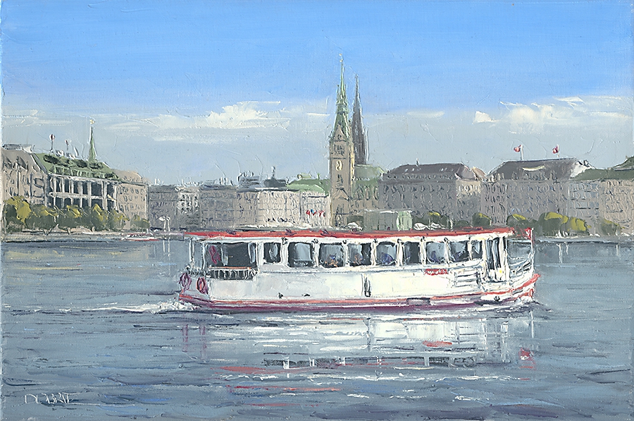 Im Fundus des Künstlers finden sich neben Hafen- und Schiffporträts oft großformatige Landschaftsbilder und Stadtansichten; auf Malreisen durch Europa entstanden u.a. reizvolle Alpen-, Toskana- und Venedigbilder. Bei Ausführung und Motivwahl zeigt sich in den Bildern des Künstlers dabei stets seine Verbundenheit zur norddeutschen Heimat und dem Wasser. So finden sich in der vorliegenden Auswahl nicht zufällig immer wieder das Hamburger Hafen- und Stadtgebiet, das den Künstler in seiner Vielseitigkeit zu stets neuen, besonderen Blickwinkeln inspiriert.