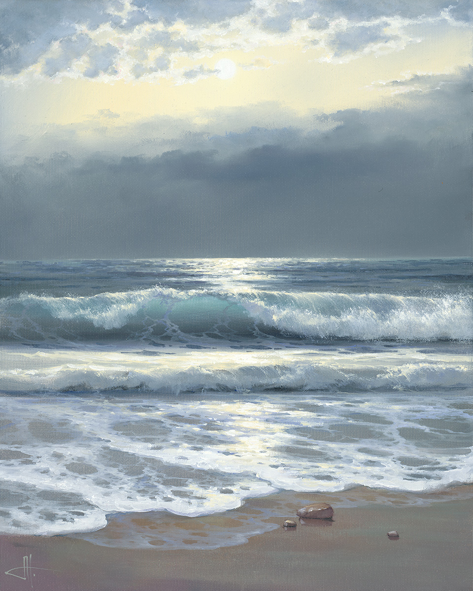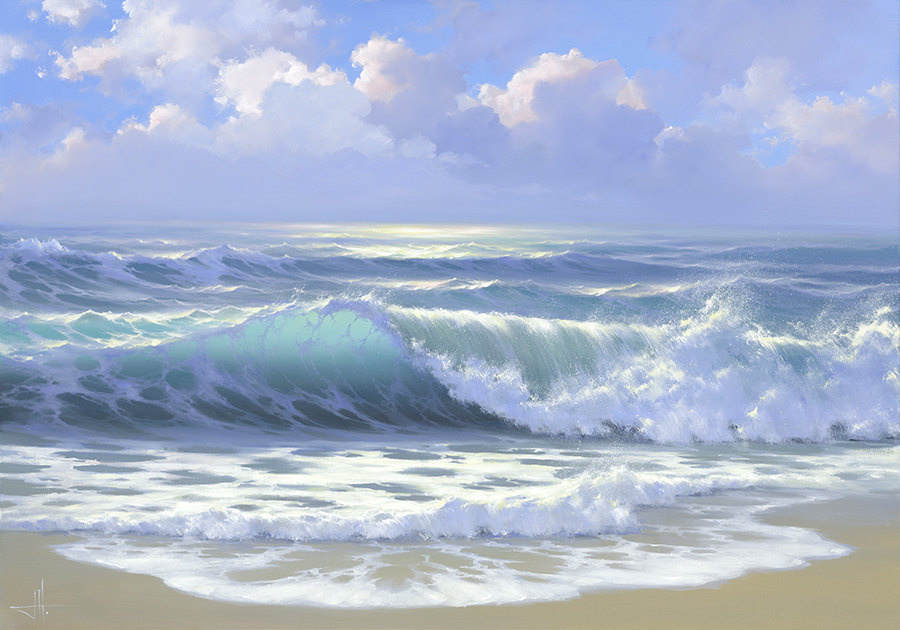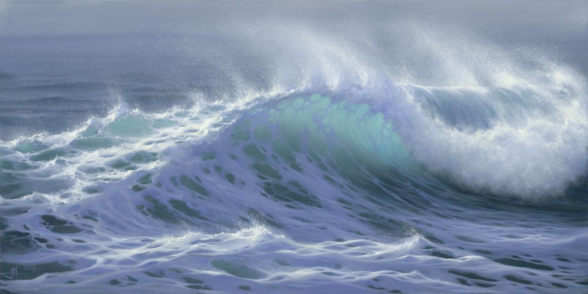 Das Meer auf ihren Leinwänden zeigt sich in vielen Facetten: geheimnisvoll, unbeständig, unermesslich —es lebt ein eigenes Leben, geprägt von Bewegung, Aufregung und Schönheit. Sonnenstrahlen brechen sich in den Wellen und spielen mit unterschiedlichen Schattierungen, sodass der Betrachter die Lebendigkeit des Meeres in ihrer ganzen Fülle erleben kann.