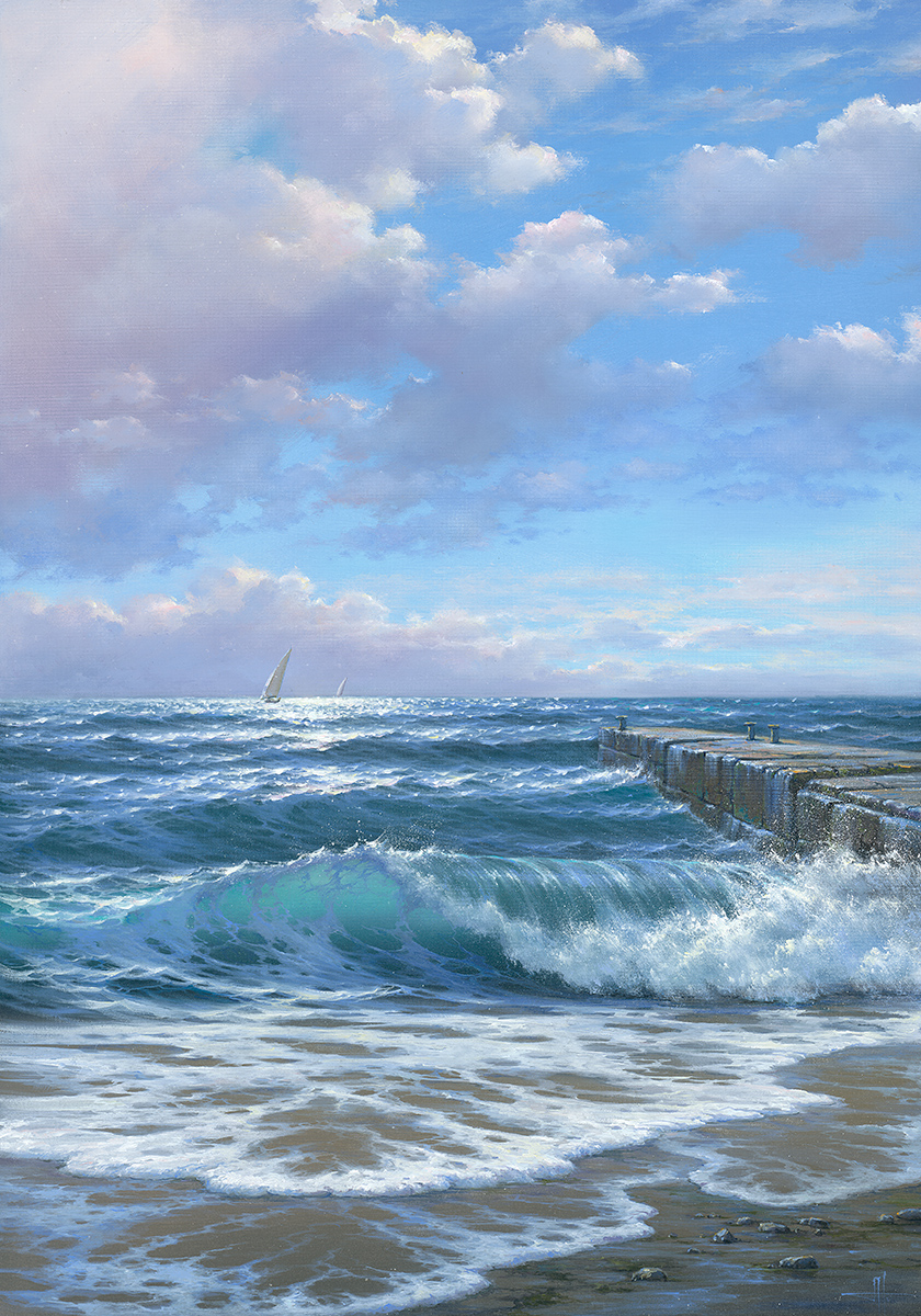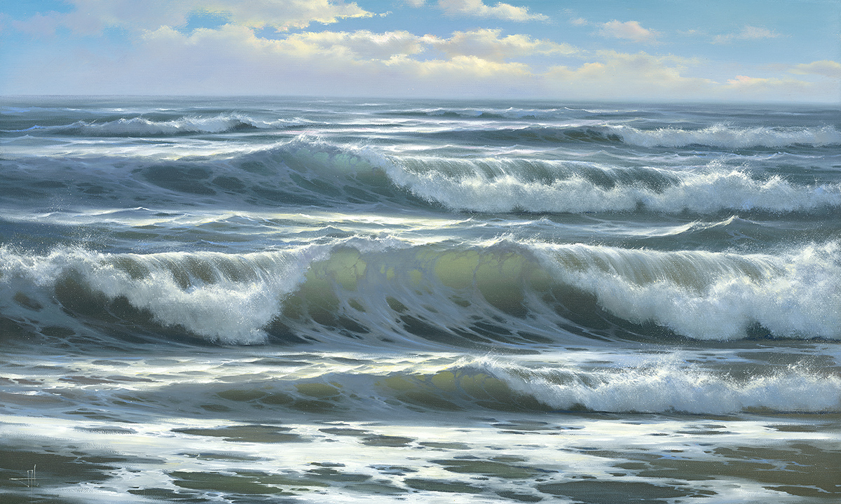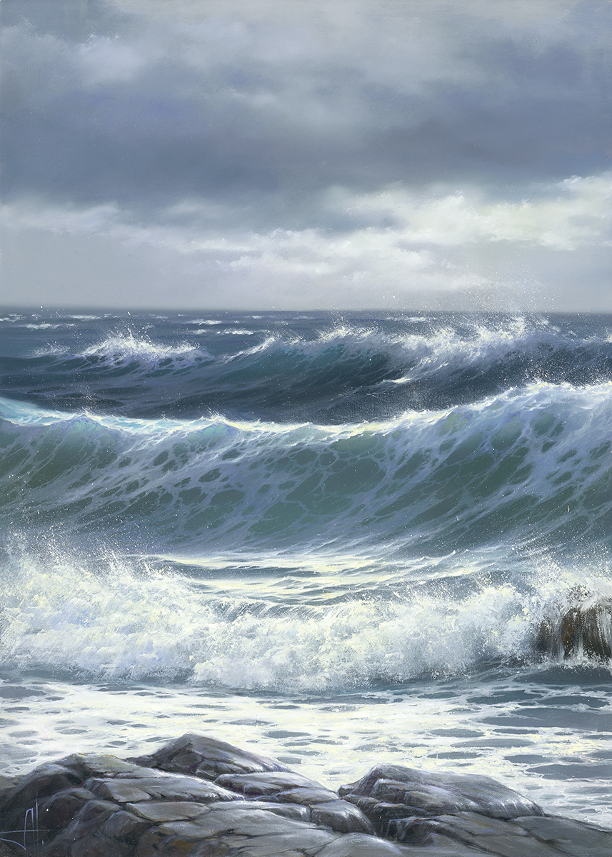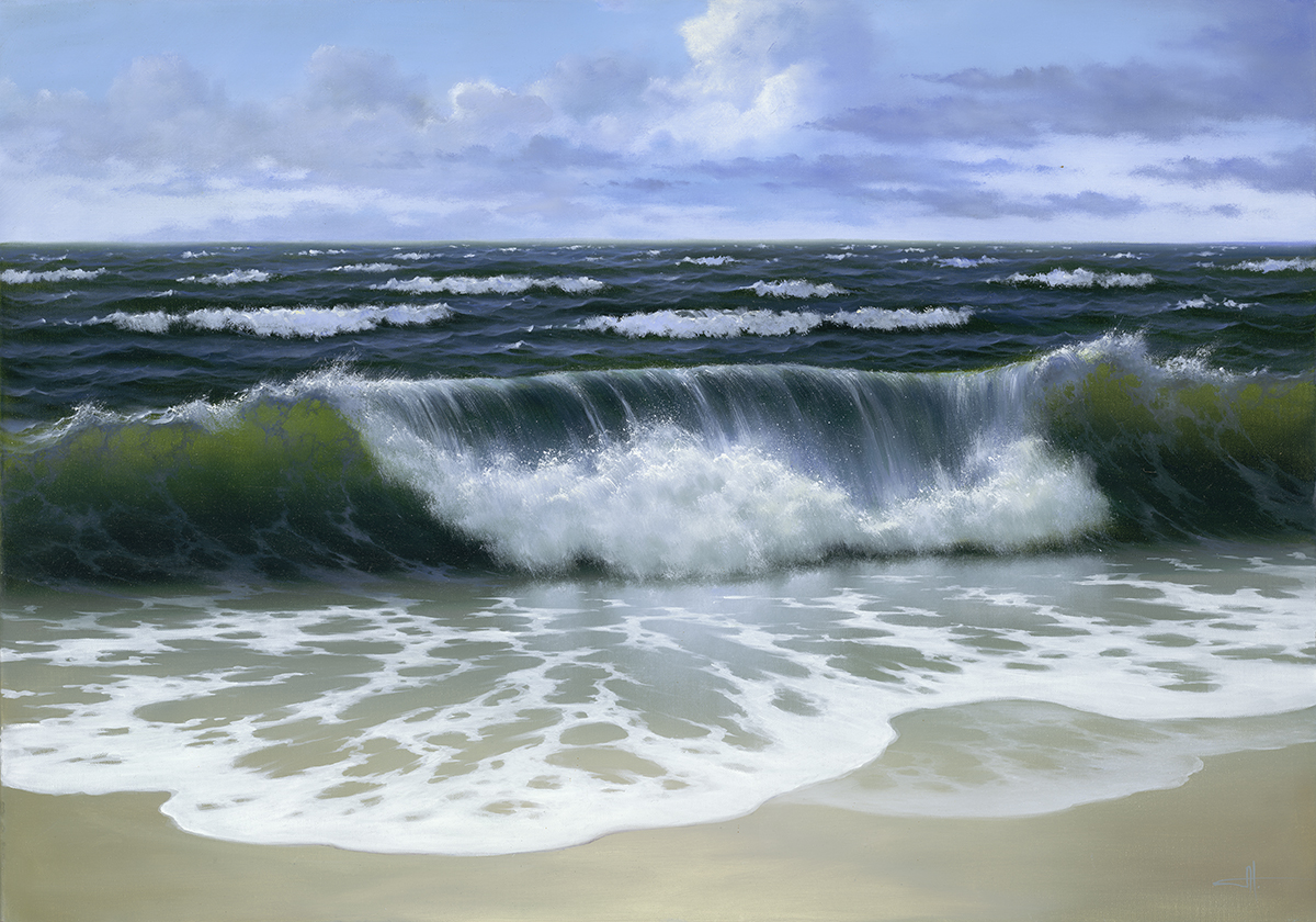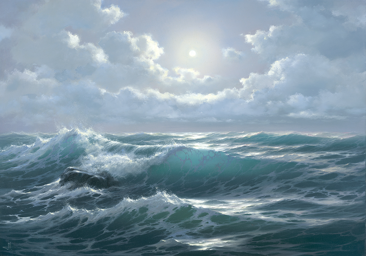 Das Meer auf ihren Leinwänden zeigt sich in vielen Facetten: geheimnisvoll, unbeständig, unermesslich —es lebt ein eigenes Leben, geprägt von Bewegung, Aufregung und Schönheit. Sonnenstrahlen brechen sich in den Wellen und spielen mit unterschiedlichen Schattierungen, sodass der Betrachter die Lebendigkeit des Meeres in ihrer ganzen Fülle erleben kann.